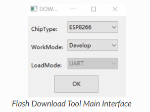 В первом окне выбираем "ESP8266", "Develop", UART и нажимаем кнопку ОК